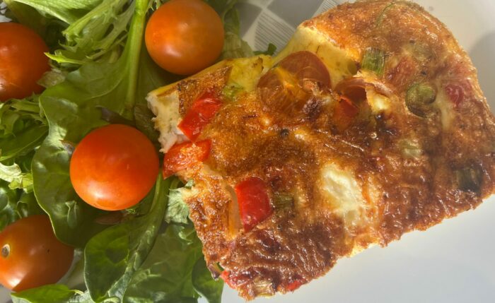 All the eggy goodness of quiche without the pastry. Serve with bread or potatoes and a salad. You could use any chopped veg if you prefer, or add ham for a meaty option. When fresh tomatoes/peppers are out of season, use sun-dried tomatoes or frozen sliced peppers instead.